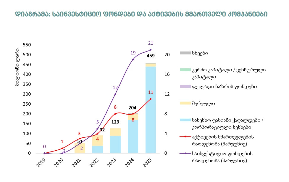„2025 წლის 31 დეკემბრის მდგომარეობით ეროვნული ბანკის მიერ 11 აქტივების მმართველი კომპანია და 21 საინვესტიციო ფონდი იყო რეგისტრირებული.