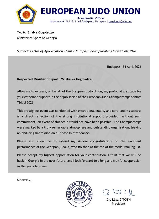 „პატივცემულო სპორტის მინისტრო, ბატონო შალვა გოგოლაძე, ნება მიბოძეთ, ევროპის ძიუდოს კავშირის სახელით გამოვხატო ჩემი მადლიერება თქვენი ღირსეული მხარდაჭერისთვის უფროსებს შორის თბილისის 2026 წლის ძიუდოს ევროპის ჩემპიონატის ორგანიზებაში.